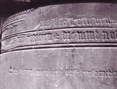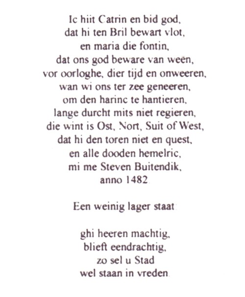Dit opschrift, zoals het hier staat, is na een grote reparatie aan het einde van de 18e eeuw, onder ijzeren banden ( die nodig waren om een scheur te herstellen) voor het grootste gedeelte verborgen. Om te voorkomen dat het gedichtje voorgoed verdween, heeft, zo zegt Been, 'even van te voren een zeer vertrouwbaar persoon er een afschrift van gemaakt'.