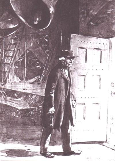 Beiaardier Tibbe verlaat de uurwerkzolder (In: Heintjes groote vacantie, Kluitman 1908, de illustrtie is van Joh. Brakensiek)
